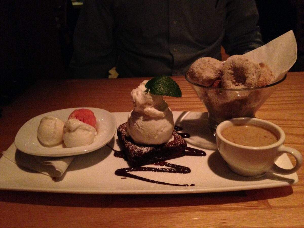 The first is in a wonderful restaurant called Matchbox (www.matchboxmerrifield.com)  here in the US and it includes three scoops of sorbet, a brownie sundae, and homemade doughnuts (as well as coffee). May I point out that, as delicious as this dessert was, it is definitely the “American” version– all three desserts were big enough to stand alone (in my opinion). Again, I’m not complaining- it was absolutely delicious, but I will say that my husband and I shared it and we STILL couldn’t finish it all.